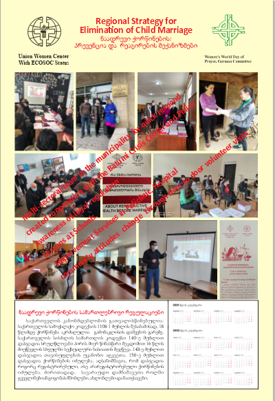 The project was implemented by two organizations — Union Women Center (Georgia)and Baku Volunteer Centre of Azerbaijan (Azerbaijan). The project addressed reduce facts of early marriages and discrimination through coordinate joint activities of representatives of the legislative and law enforcement agencies, community and local organizations, health care professionals, religion leaders .